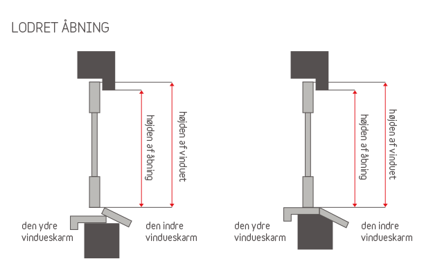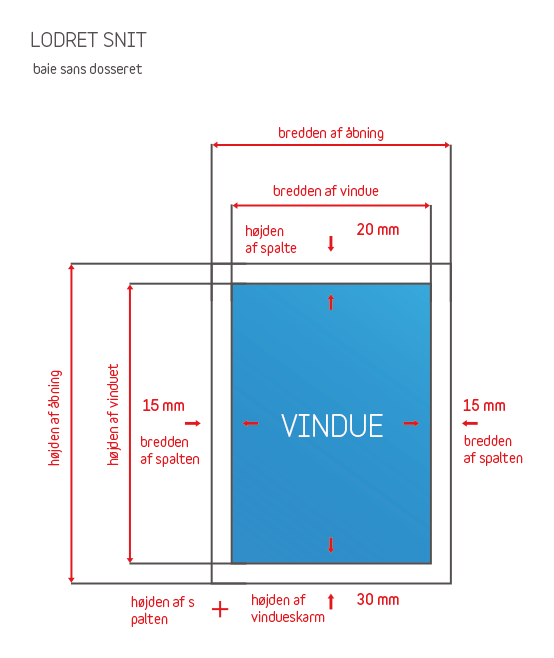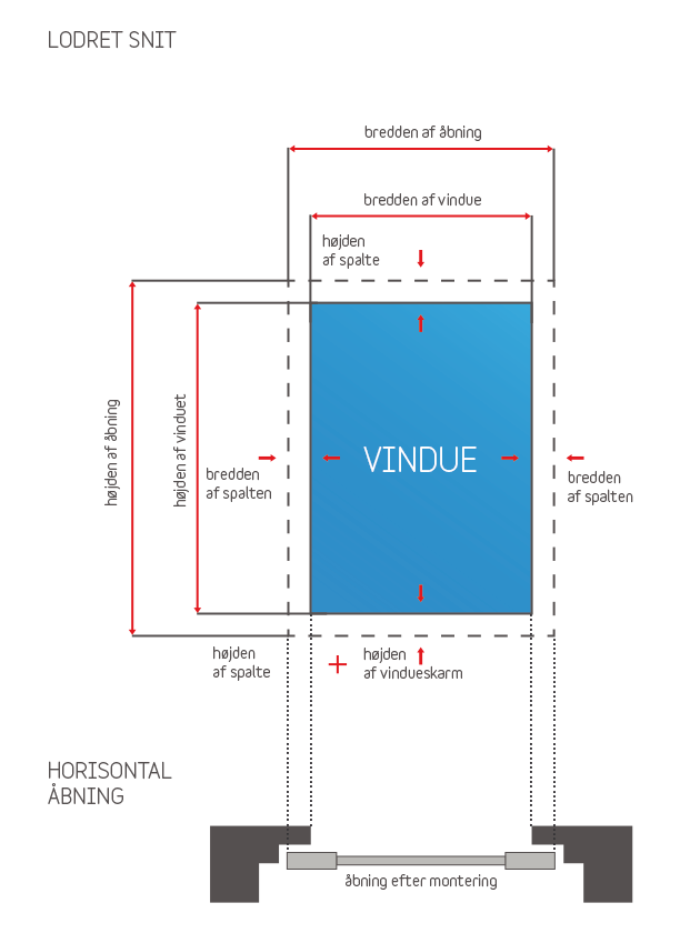 Bemærkning: ved opmåling af højden af vinduerne skal man forsyne vinduet med et spillerum nederst i vinduet, hvorunder bliver der monteret en monteringsliste med en højde på 30 mm.