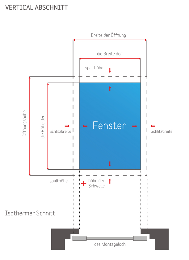 Die Maße des Fensters sollen richtige Einstellung und Horizontierung ermöglichen. Für Einhaltung der richtigen Fensterfunktionstüchtigkeit soll ein entsprechender Raum zwischen dem Fenster und der Wand freigelassen werden. Die Breite der Einbauspiels (der Spalte) hängt mit der Farbe, Größe und dem Fensterwerkstoff zusammen. Empfohlene Spaltenbreiten sind der nachfolgenden Tabelle zu entnehmen. Meistens werden die Fenster in den Öffnungen mit und ohne Anschlag eingebaut.